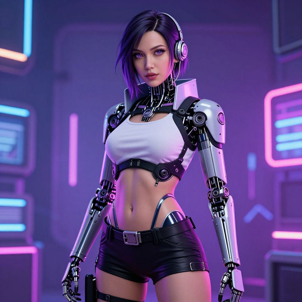 Photorealistic CGI image of a young woman with light brown skin and striking green eyes, standing in a dimly lit, futuristic room with neon blue and pink lights. She has long, brown dreadlocks adorned with metallic accessories. She wears a sleek, black, high-tech bodysuit with silver, circular breastplates and intricate, glowing circuitry patterns. Her expression is focused and intense. The background is blurred, featuring indistinct machinery and a dark, industrial setting. The overall aesthetic is cyberpunk, with a strong emphasis on high-tech and futuristic elements.