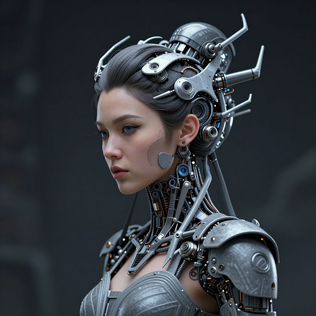 The image depicts a highly detailed and intricate portrait of a young punk biomechanical cyborg woman, reminiscent of the style of H.R. Giger. The subject is adorned in a futuristic, cyberpunk outfit with a symmetrical design, featuring a combination of metallic and organic elements. The outfit includes a high-collared, form-fitting top with intricate, interwoven patterns and a series of mechanical components that resemble a network of pipes and wires. The subject's hair is styled in elaborate dreadlocks, each adorned with small, metallic attachments that add to the cybernetic aesthetic. The background is a moody, neon-lit environment that enhances the cyberpunk theme, with a soft, diffused lighting that highlights the intricate details of the subject's attire and accessories. The overall composition is balanced, with the subject positioned centrally, drawing the viewer's attention to the detailed textures and colors of the outfit and accessories. The image is shot with a shallow depth of field, emphasizing the subject while softly blurring the background, and is captured with a high level of detail, likely in an 8K resolution, showcasing the artist's mastery of hyper-realistic rendering techniques.