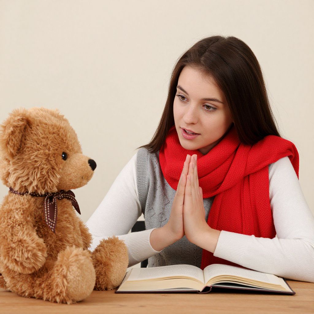 Photograph of a young woman with dark hair in a ponytail, wearing a red scarf and white shirt, praying beside a brown teddy bear and