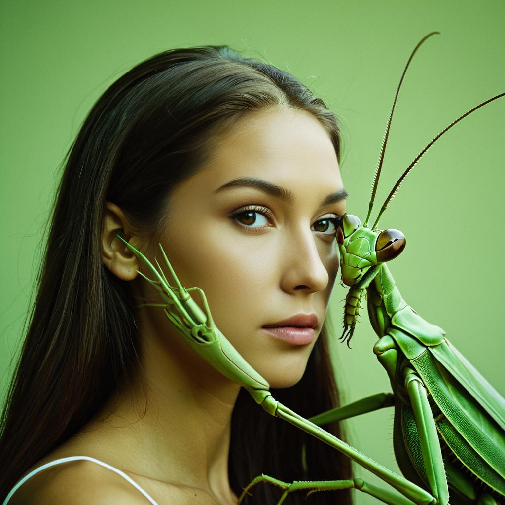A close-up portrait of a young woman with a giant green praying mantis seamlessly integrated with her hair and head, surreal fantasy style, biomorphic fusion of insect and human, soft natural lighting highlighting smooth skin texture and vivid green insect details, earthy green and brown color palette, simple muted background
