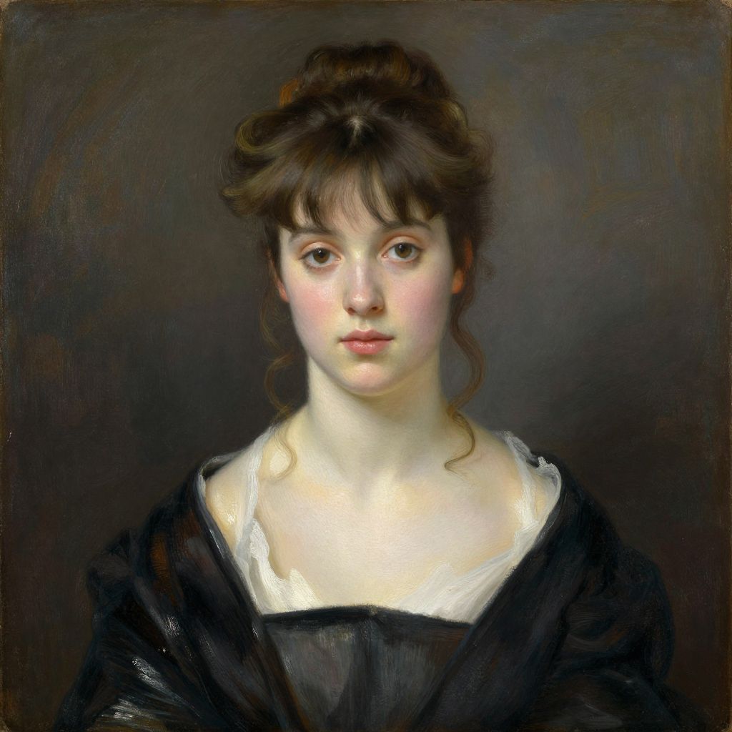 This is a digital painting in a classical style portraying a young woman with fair skin and delicate features. She has soft brown hair styled in a loose updo with bangs gently framing her face. Her large, expressive brown eyes gaze directly at the viewer with a calm, slightly melancholic expression. She wears a black dress with a white, ruffled neckline and a small red ribbon tied at the front. The background is a muted, textured gray, which helps to highlight her pale complexion and the subtle, realistic brushstrokes of her hair and clothing. The overall composition is simple yet elegant, emphasizing the subject's serene and introspective demeanor.