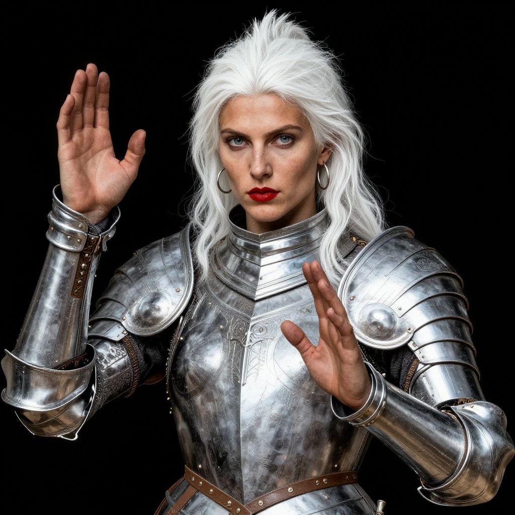 This digital CGI image depicts a stern-looking woman with pale skin and striking white, wavy hair, standing against a black background. She is clad in shiny, silver medieval-style armor with detailed engravings and a brown leather belt. Her blue eyes are intense, and she has bright red lipstick. She raises both hands, palms facing outward, in a gesture of surrender or defense. The armor covers her chest, shoulders, and arms, with visible segmented plates and rivets. Her expression is serious and focused. The overall style is realistic with a slight fantasy element, highlighting the contrast between her white hair and the metallic armor.