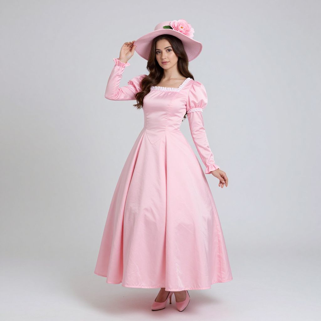 Photograph of a young woman with fair skin and long, wavy brown hair. She is wearing a full-length, pink satin dress with long sleeves and a square neckline, accented with white lace. Her matching pink hat features a large flower on the right side. She stands against a plain white background, holding the brim of her hat with her right hand, and has pink heels. The dress and hat create a vintage, elegant look. Her expression is neutral, and she stands with a slight forward lean.