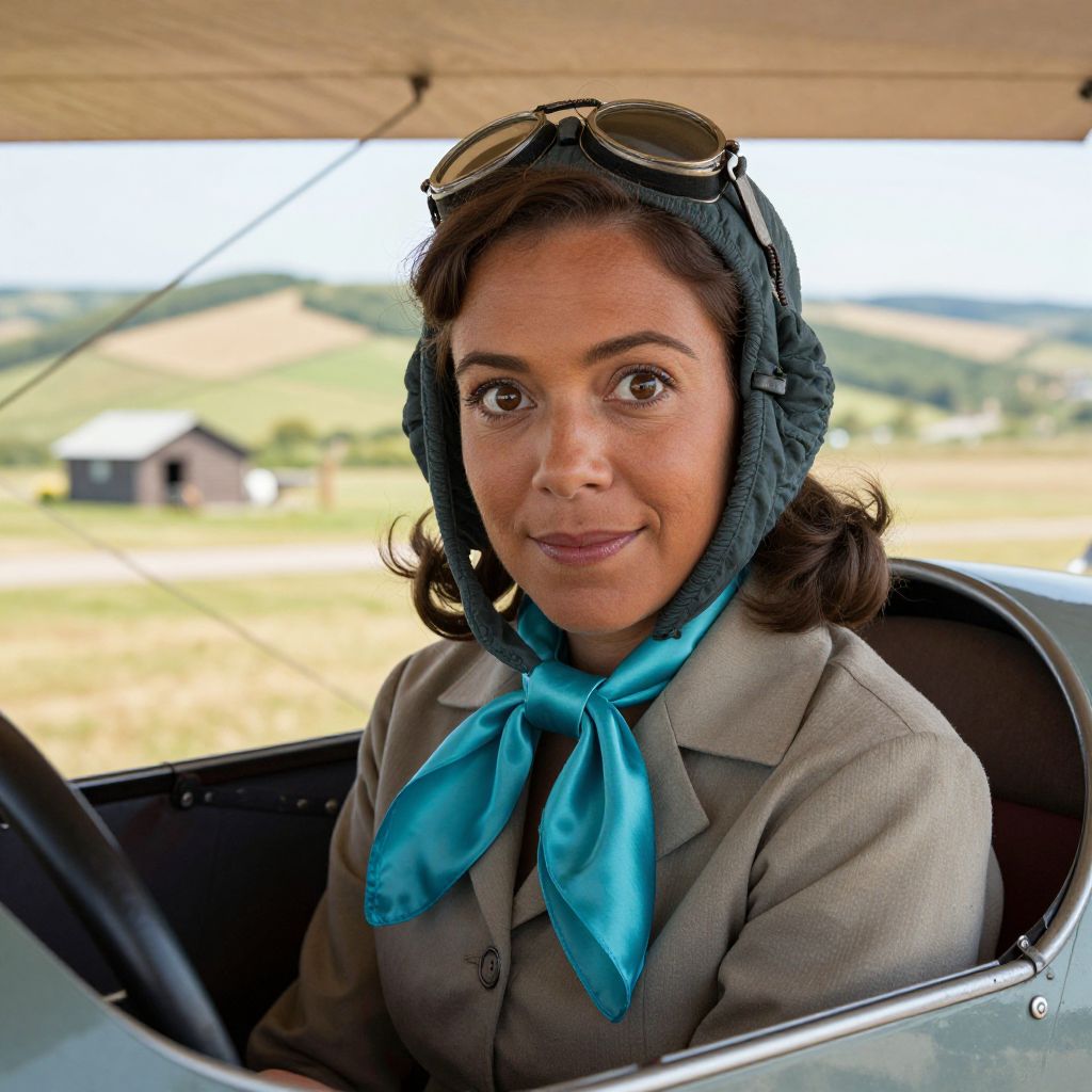 Realistic portrait of a 1930s female pilot with warm brown skin, wide eyes, and a faint smile, wearing a vibrant turquoise silk scarf pinned at her collar, inside a vintage cockpit of a monoplane during a sunny morning flight over a countryside field with rolling hills and a small wooden airport in the distance, showcasing aviation chic and feminine elegance