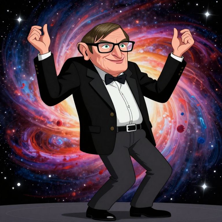 Animating Process Stephen Hawking dancing, cosmos background, clear facial features, energy, vibrant colors, by Larry Clark and Annie Leibovitz and Martin Schoeller,
