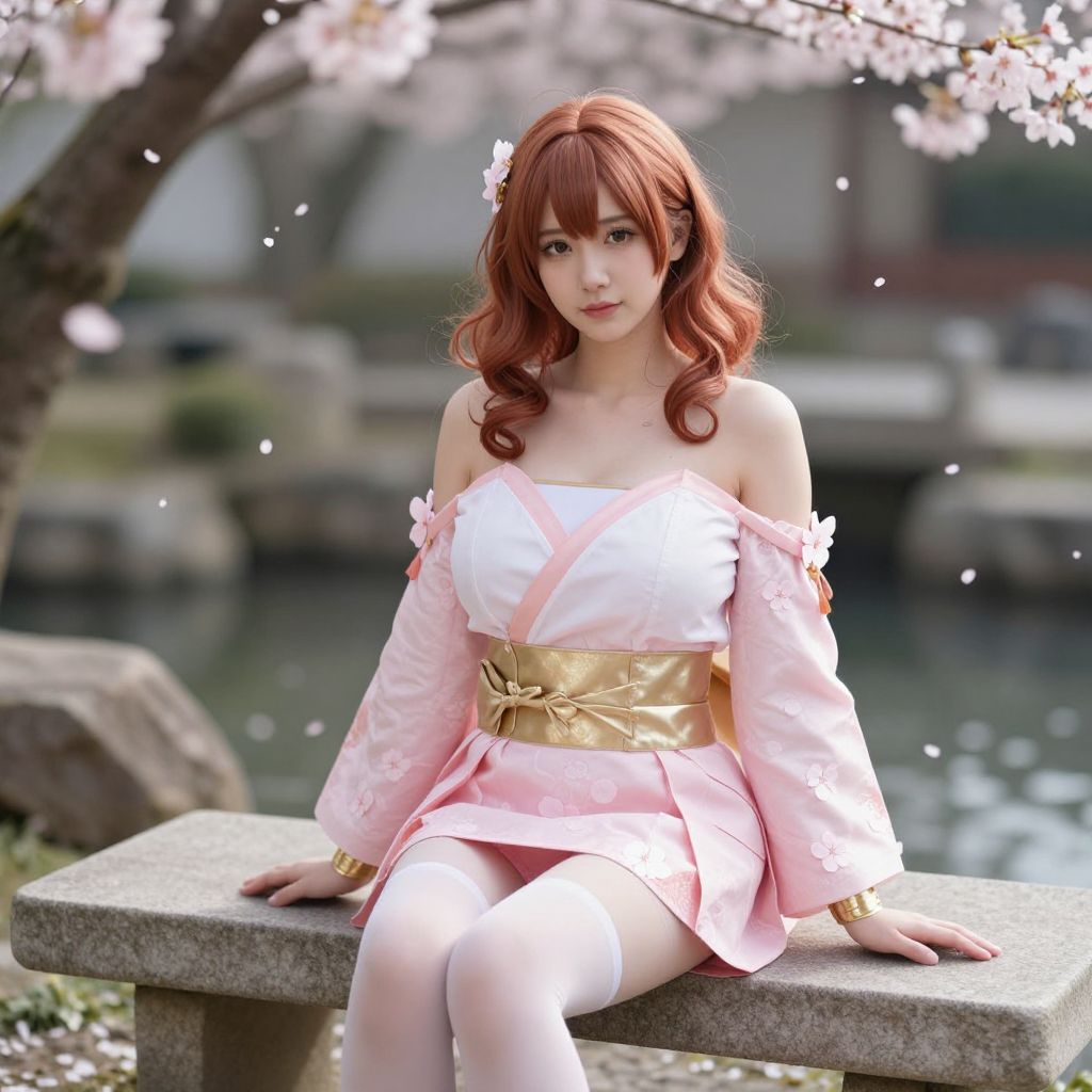 A digital art image of a young Asian woman with fair skin and wavy auburn hair, adorned with a pink flower. She wears a pink and white off-shoulder kimono-style dress with gold accents and white thigh-high stockings. She sits on a stone bench in a serene, cherry blossom-filled garden by a pond, with blurred buildings in the background. Cherry blossom petals float in the air, adding a delicate touch to the tranquil scene. The soft lighting enhances her gentle expression and the gentle colors of her attire.