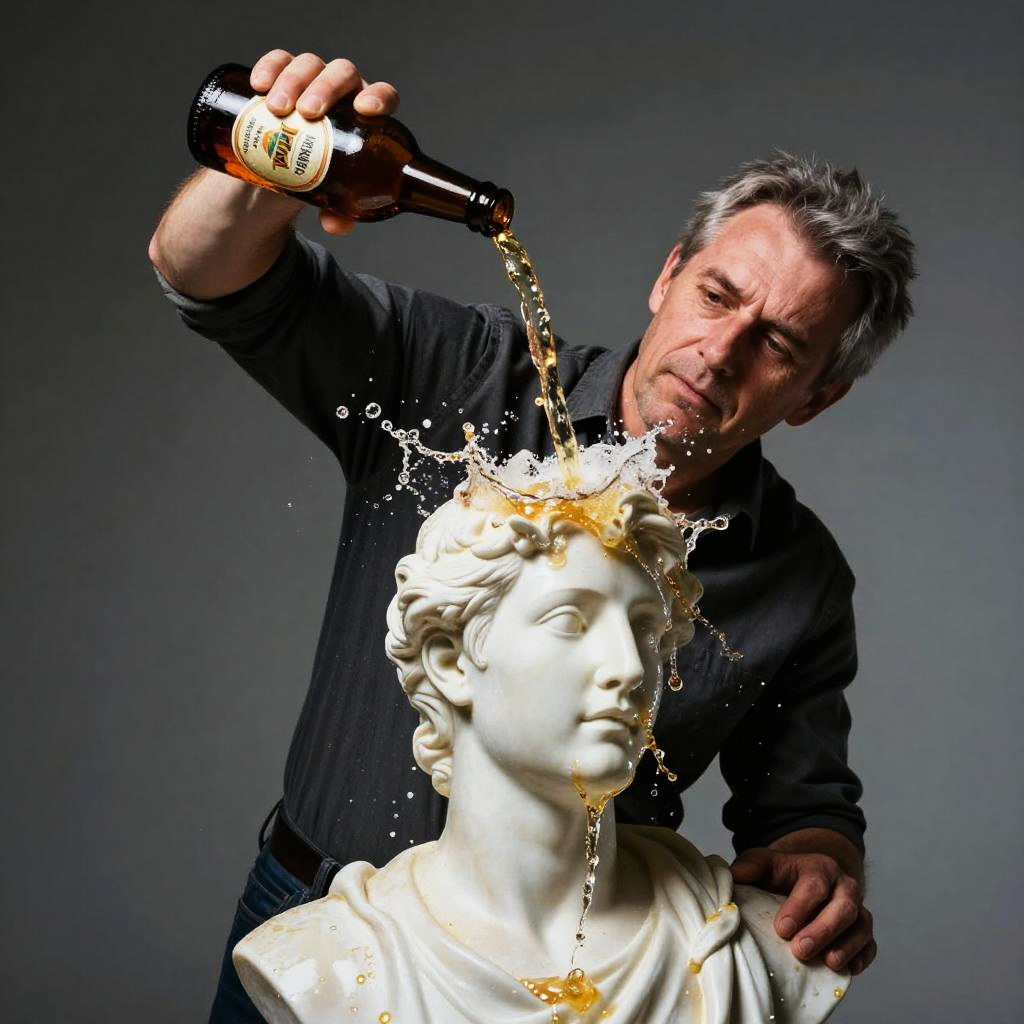 A dramatic, digitally altered photograph shows a middle-aged man with short gray hair pouring beer from a bottle onto the head of a statue. The beer splashes mid-air, creating a liquid explosion that partially dissolves the statue's face. The man, dressed in a dark shirt, leans forward intently. The background is a gradient of dark to light, adding intensity to the scene.