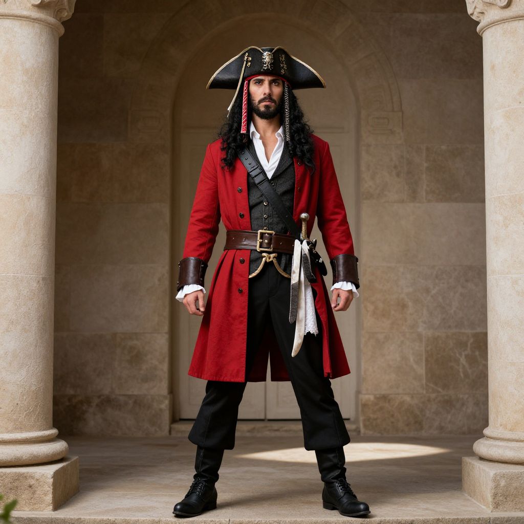 Photograph of a man dressed as a pirate stands confidently between two stone columns in a medieval-style stone archway. He wears a tricorn hat with a black ribbon, a red, knee-length coat with black cuffs and buttons, a black vest, white shirt with ruffled cuffs, black trousers, and black boots. His long black hair and beard are visible. A brown belt with a silver buckle and white sash are draped across his waist. The background is a textured, beige stone wall with an arched doorway. The lighting is natural, casting soft shadows. The overall style is realistic and detailed.