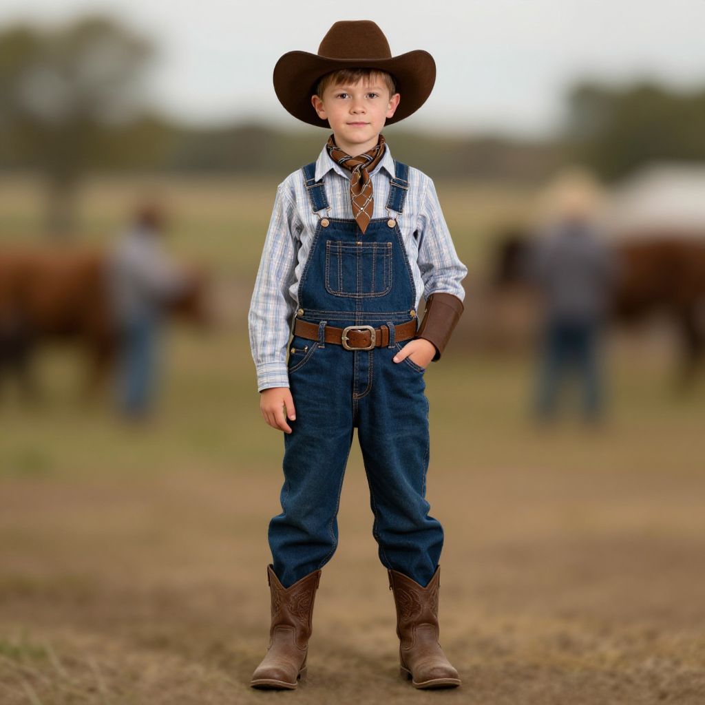 Farm costume, 1boy, male focus, solo, hat, boots, scarf, cowboy hat, overalls, shirt, striped shirt, plaid shirt, standing, blurry, hand in pocket, looking at viewer, full body, blurry background, cowboy western, brown headwear, belt