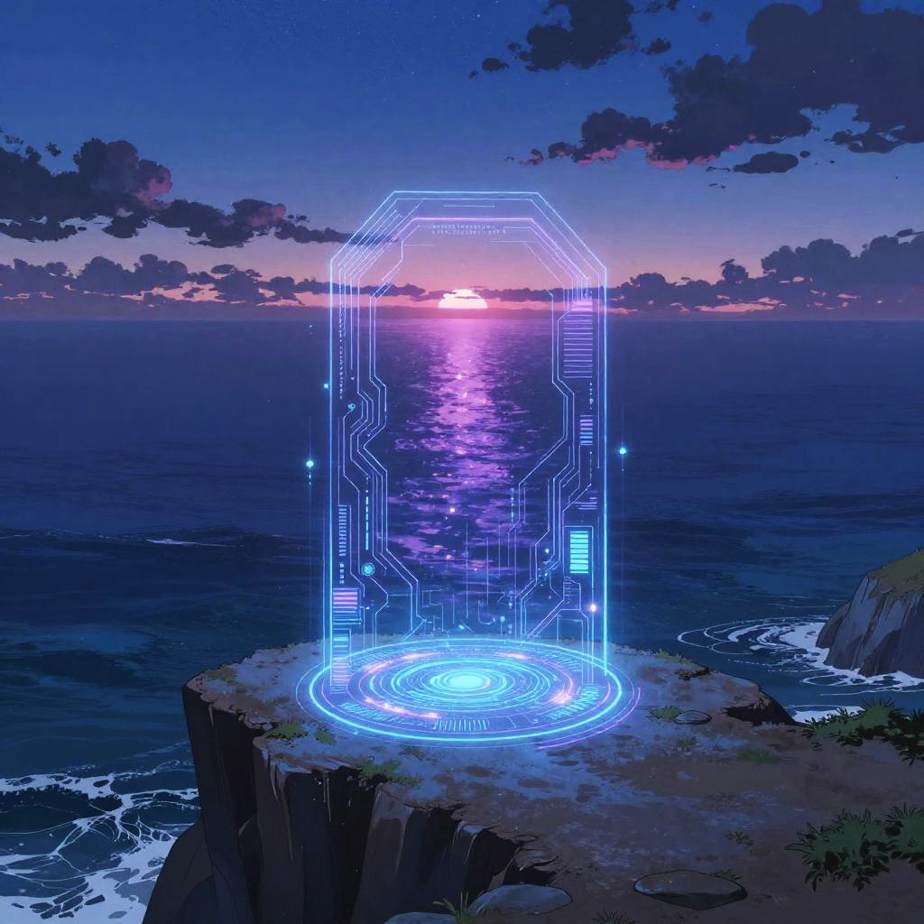 Anime world portal glowing with vibrant neon colors, swirling mystical energies, surrounded by futuristic cityscape and floating islands, cherry blossom petals drifting through the air, in a dynamic and colorful style, highly detailed anime environment
