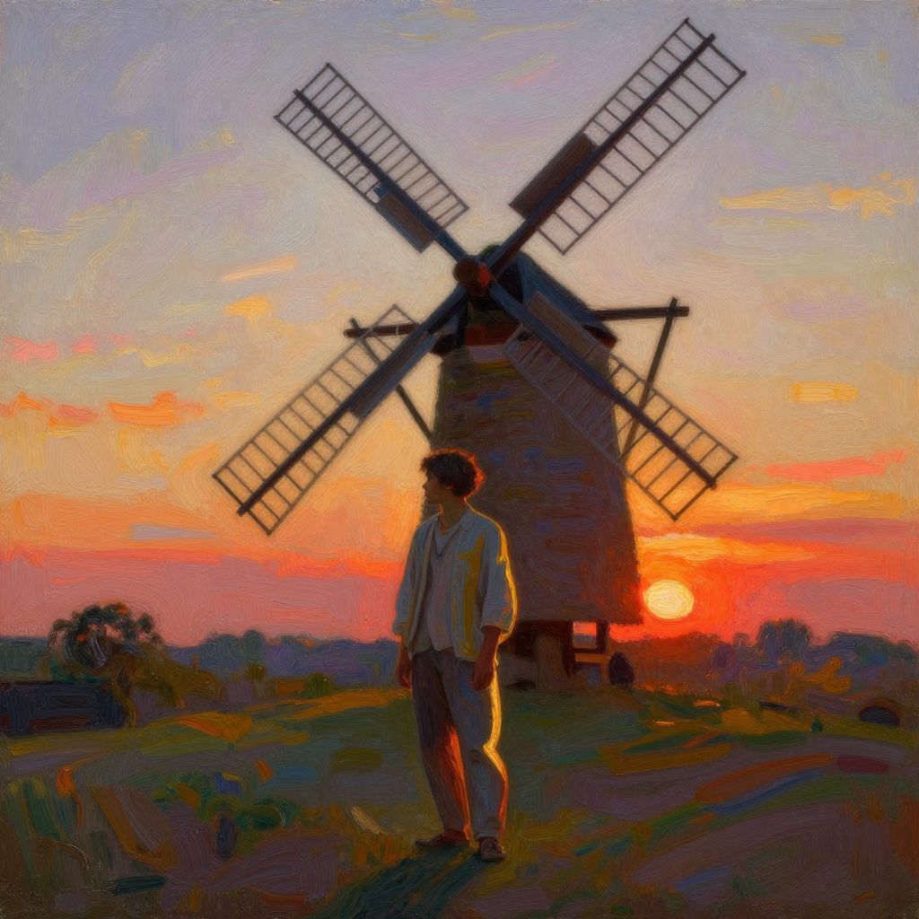 Digital painting of a man in a white shirt and pants, standing in front of a sunset-lit windmill, with vivid orange and purple sky.