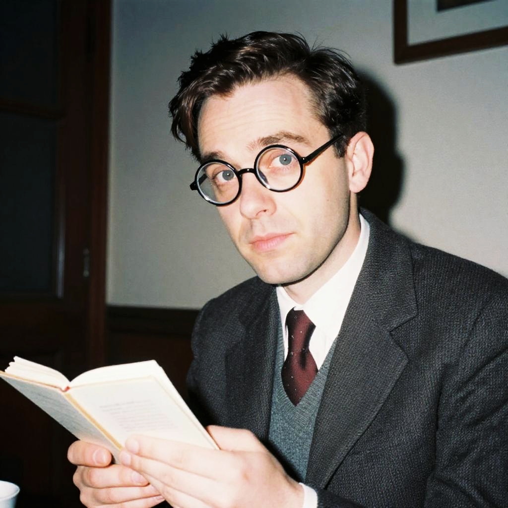 Realistic film photograph taken with direct flash with overexposure and hard shadows, the photograph shows a man in a turtleneck sweater holding a typewriter, vintage interior. Vibe is cozy and introspective.
