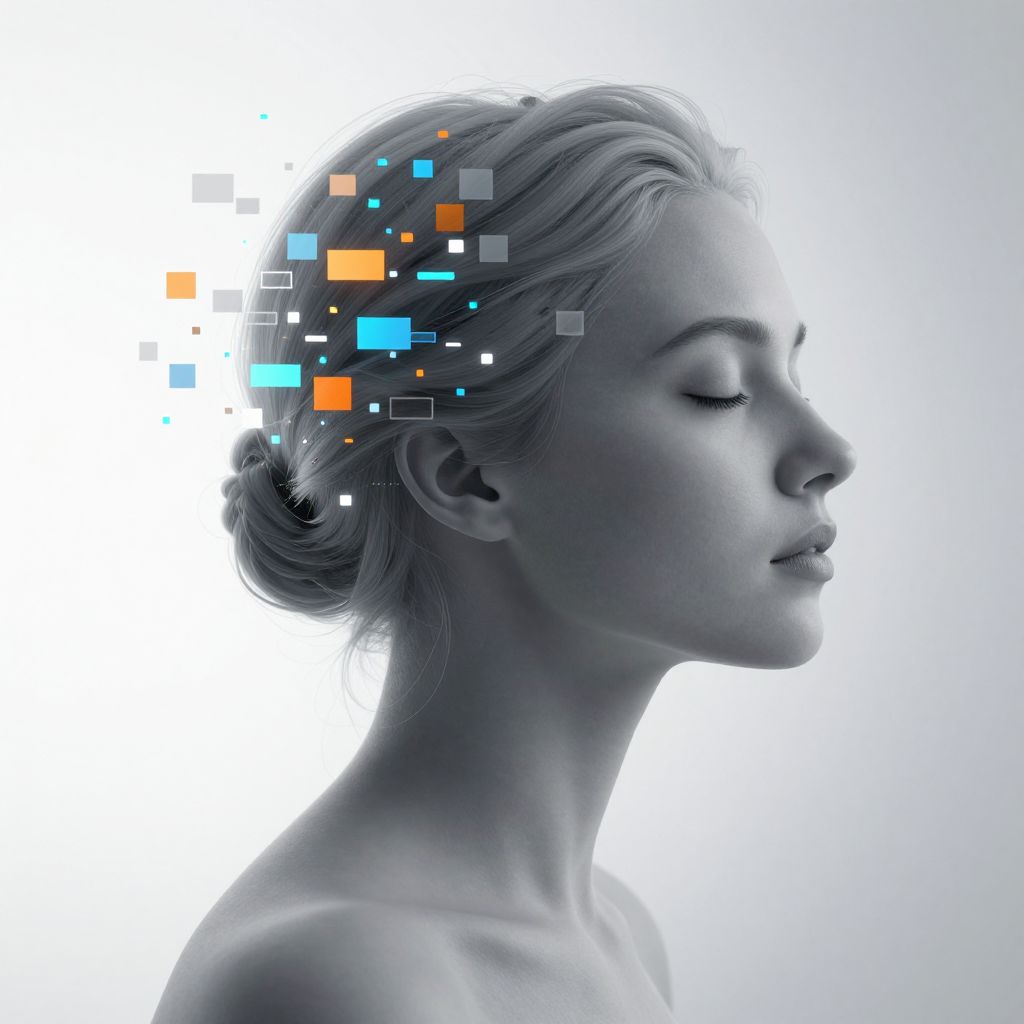 This digital art piece features a side profile of a serene, grey-toned woman with closed eyes. Her head is fragmented with glowing, colorful pixels—orange, blue, and white—emanating from her hair, giving a cybernetic feel. The background is a soft gradient from white to grey, highlighting her peaceful expression. The overall style combines realism with a futuristic, digital aesthetic.