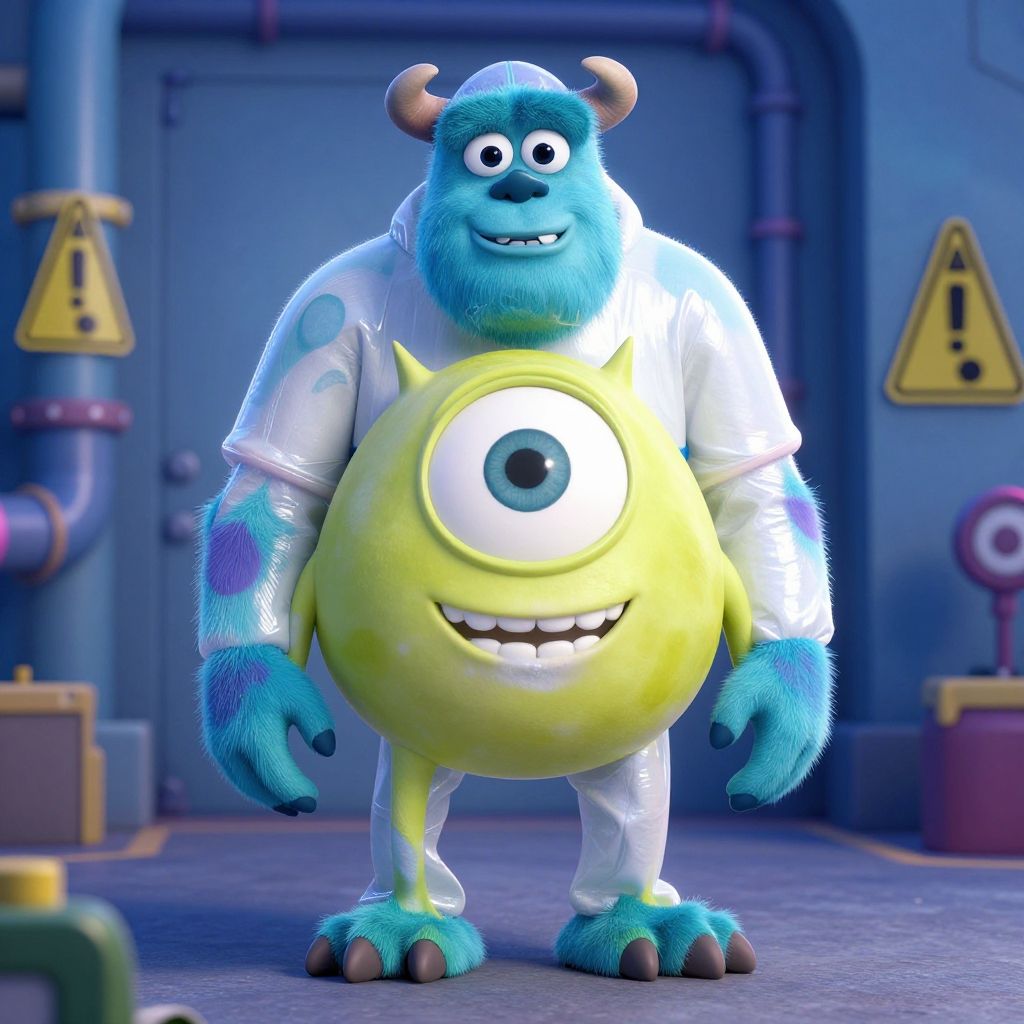 Monsters Inc hazmat suit costume, a full-body furry monster wearing a protective hazmat suit with iconic Monsters Inc patterns, surrounded by glowing containment chambers, animated movie style, detailed textures and vibrant colors