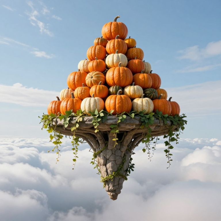 A whimsical, inverted stone spire adorned with cascading vines supports a fantastical pyramid of stacked pumpkins suspended high above a sea of clouds, defying gravity and reality alike.