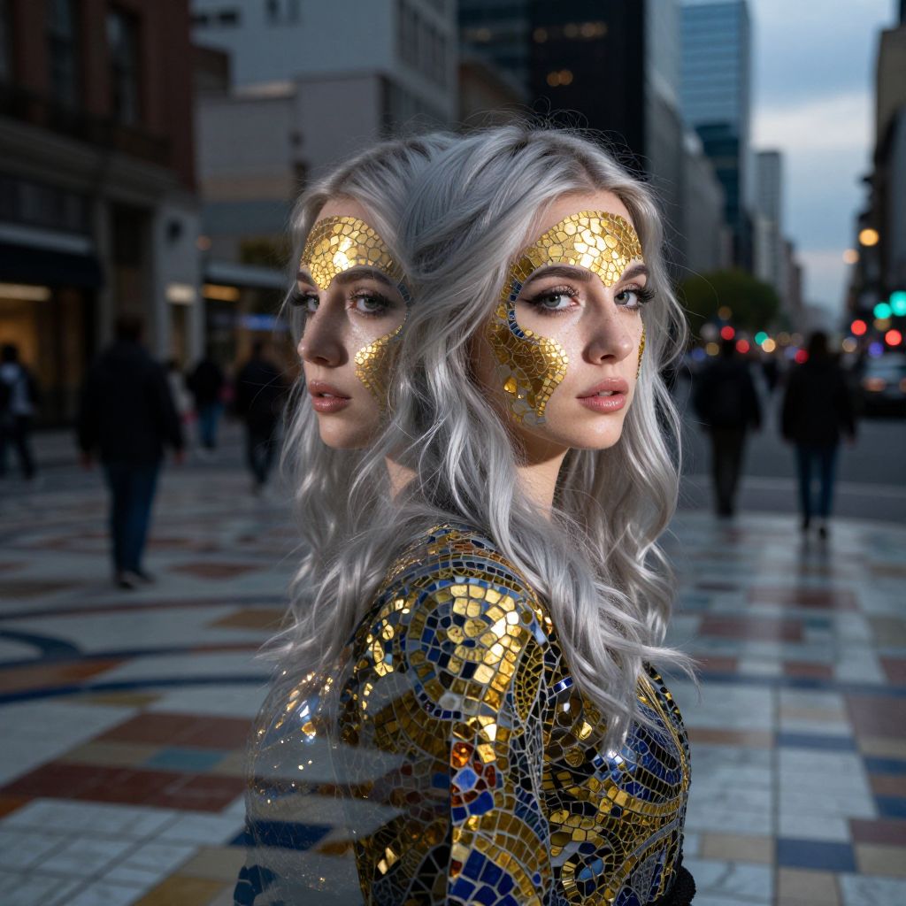 Photograph of a woman with long, wavy silver hair, standing in an urban street at dusk. She has a striking gold and glittery facial design on her forehead and cheeks, and is wearing a sequined, gold and blue top. Her skin is fair, and she has full lips and dark, defined eyebrows. The background shows a blurred cityscape with tall buildings and pedestrians, and the street has a colorful, checkered pavement. The image has a slightly surreal, hyper-realistic style, with dramatic lighting and shadows enhancing the gold accents.