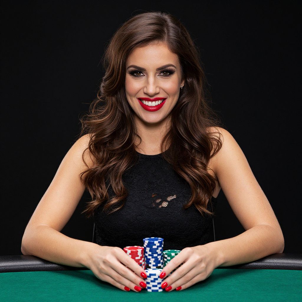 Photograph of a smiling woman with long, wavy brown hair, wearing a black lace sleeveless top. She's sitting at a green poker table, holding a stack of colorful poker chips (red, blue, white, and green) in front of her. Her bright red lipstick and nail polish stand out against the black background. She has a confident, friendly expression.