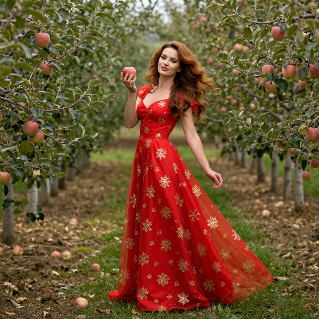 Woman in a vibrant red dress adorned with golden snowflake patterns stands gracefully amidst a lush apple orchard, her flowing hair cascading around her as she holds a single ripe red apple in her hand, surrounded by numerous apples hanging from the trees and scattered on the ground.