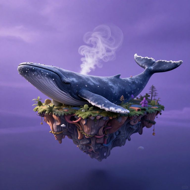 Digital artwork of a massive blue whale with white speckles, exhaling steam, floating on a lush, island-like rock formation in a vibrant purple