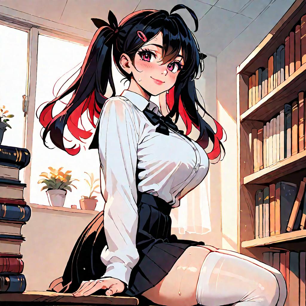 Score_9, score_8_up, score_7_up, score_6_up, score_5_up, source_cartoon, uncensored, yatsu murasaki is leaning back on tree, leaning back, holding ice cream, from side, yatsu murasaki, 1girl, mature female, full body, looking at viewer, expressionless, smile, red eyes, blue hair, long hair, bangs, glasses, ponytail, school uniform, white shirt, necktie, pleated skirt, red armband, shoes, curvy, huge breasts, outdoors, tree