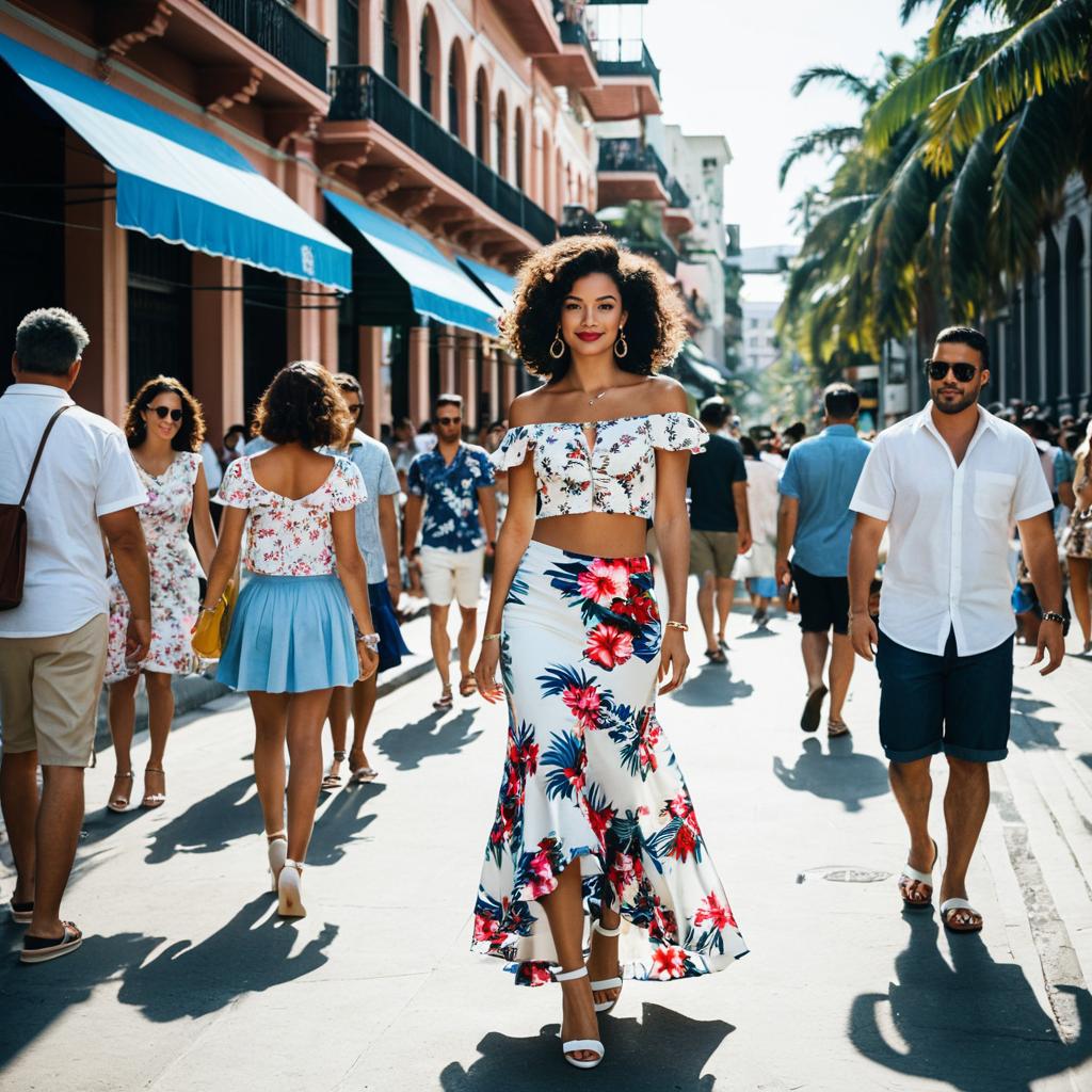 Havana outfit female party, photorealistic, street fashion, young woman, standing in urban street, summer, daytime, floral crop top, white with pink flowers, matching floral high-low skirt, white high-heeled sandals, dark brown curly hair, red lipstick, slim physique, people in background, walking, shopping street, historic buildings, blue awnings, palm trees, warm sunlight, casual outfits, woman centered, medium shot, photo realism, fashionable, stylish, confident, lively atmosphere