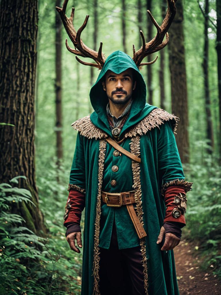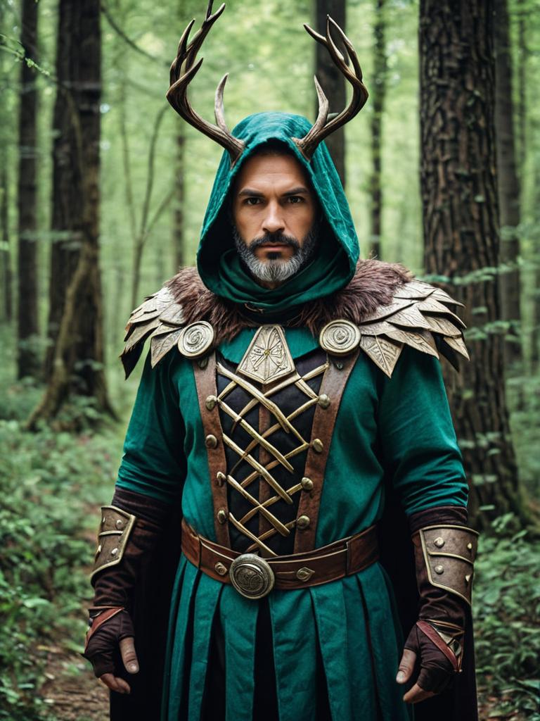 Photorealistic portrait of a man wearing an enchanted forest costume featuring a teal hooded cloak adorned with decorative wooden buttons and leaf embellishments. The costume includes brown leather arm bracers, a leather belt with a pouch, and large antlers attached to the hood. The man has a beard and stands in a dense green forest background, embodying a fantasy or cosplay character.