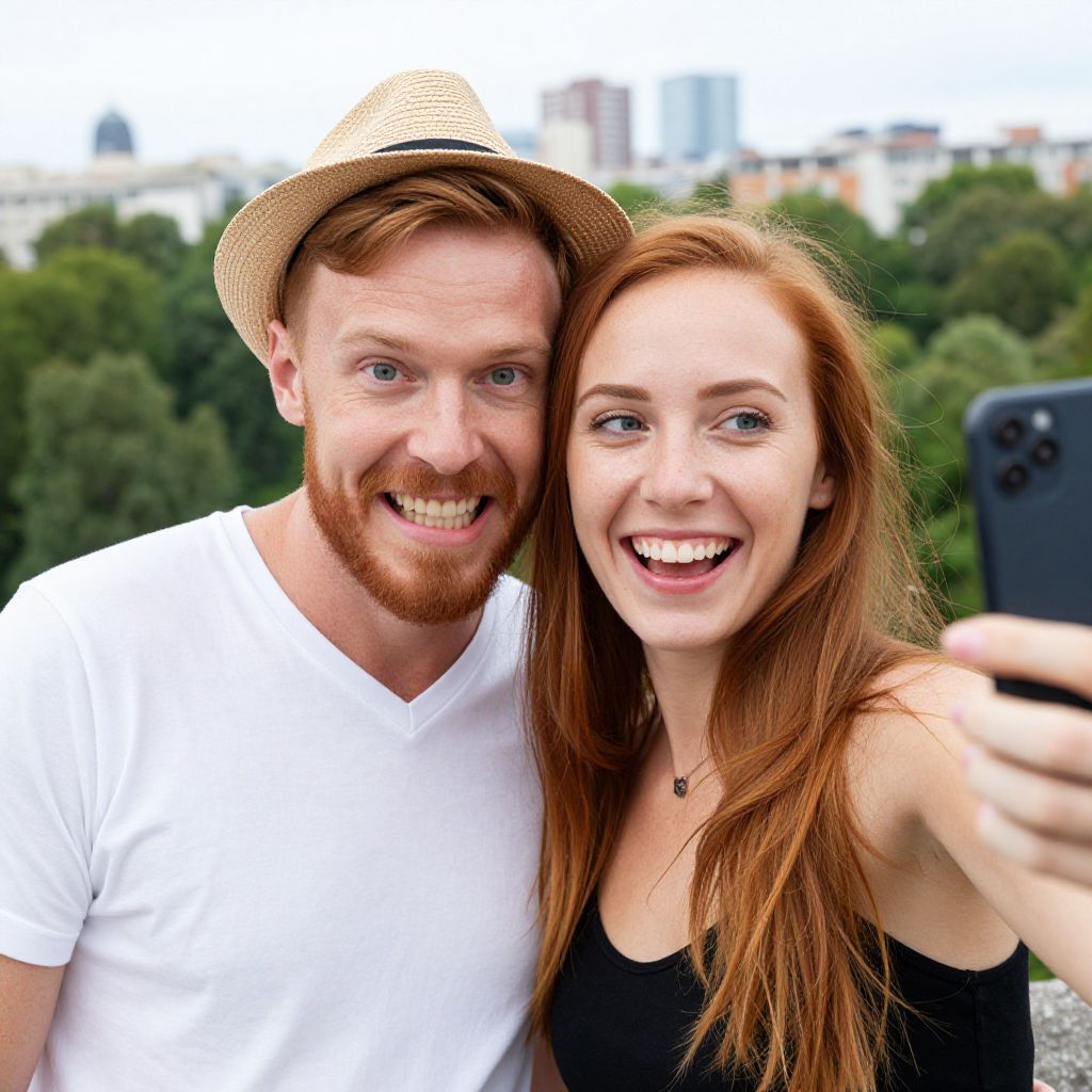 A colorful, candid photo of a smiling couple with red hair. The bearded man in a white tee and straw hat playfully bites his mustache, while the woman with long red hair and a black top takes a selfie. They're outdoors, with a blurred cityscape and green trees in the background. The woman's bright smile and the man's cheeky expression add a fun, lively vibe.
