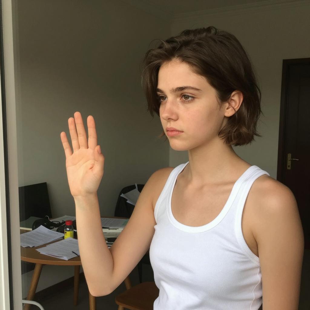 Young woman with short brown hair, white tank top, and light skin, pressing hand against a glass door. Background: cluttered room with a round table, papers, and dark furniture. Dim, yellowish lighting. Her expression is neutral, slightly pensive. One person.
