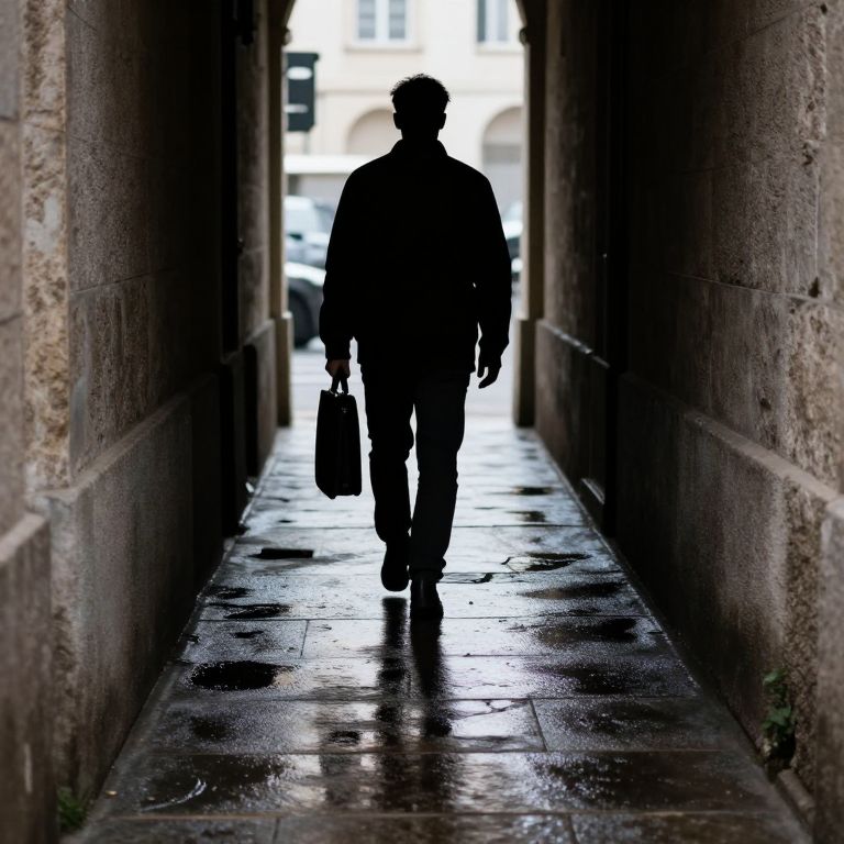 Silhouetted man with briefcase walks through dim, wet stone alleyway, backlit by bright sunlight. High-contrast photograph emphasizing shadow and