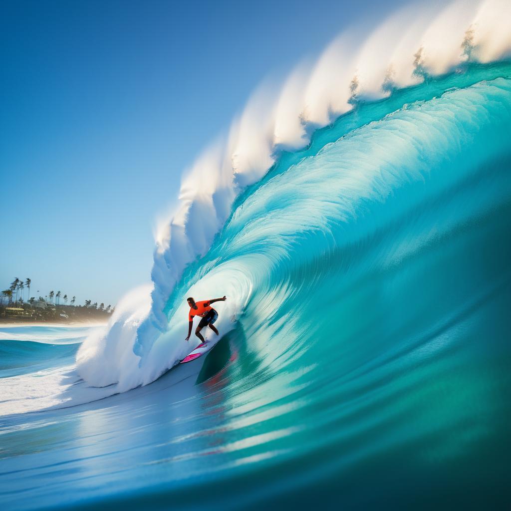 Flamboyant An exhilarating action shot of a skilled surfer riding an enormous wave off the coast of a tropical paradise. This dynamic and vivid photograph is captured using a Sony A1 mirrorless camera paired with a FE 70-200mm f/2.8 GM OSS lens, renowned for its outstanding image quality and ability to freeze motion. The camera settings are chosen to seize the energy of the moment: an aperture of f/4, ISO 800, and a shutter speed of 1/2000 sec. The composition showcases the surfers athletic prowess, the power of the wave, and the vibrant colors of the ocean and sky. The sunlight glimmers off the water, accentuating the surfers spray as they carve through the wave, encapsulating the thrill of the sport in a stunning, high-resolution image.,