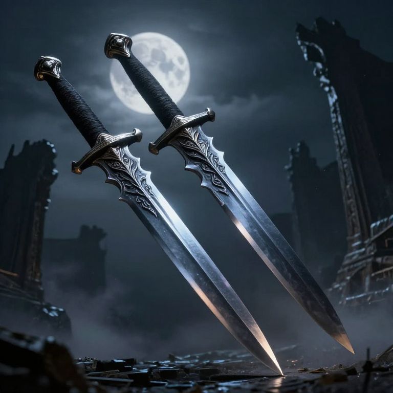 Photorealistic digital artwork depicting two ornate, silver swords with intricate, swirling patterns on their blades and black, textured handles, standing upright against a dark, misty night sky. A full moon shines brightly in the background, casting a eerie glow. The swords' tips are glowing with a faint, fiery light. The scene is set in a ruined, gothic-like cityscape with tall, broken spires and crumbling architecture, adding a sense of mystery and fantasy. The overall color palette is dark blue and black, with highlights on the swords.