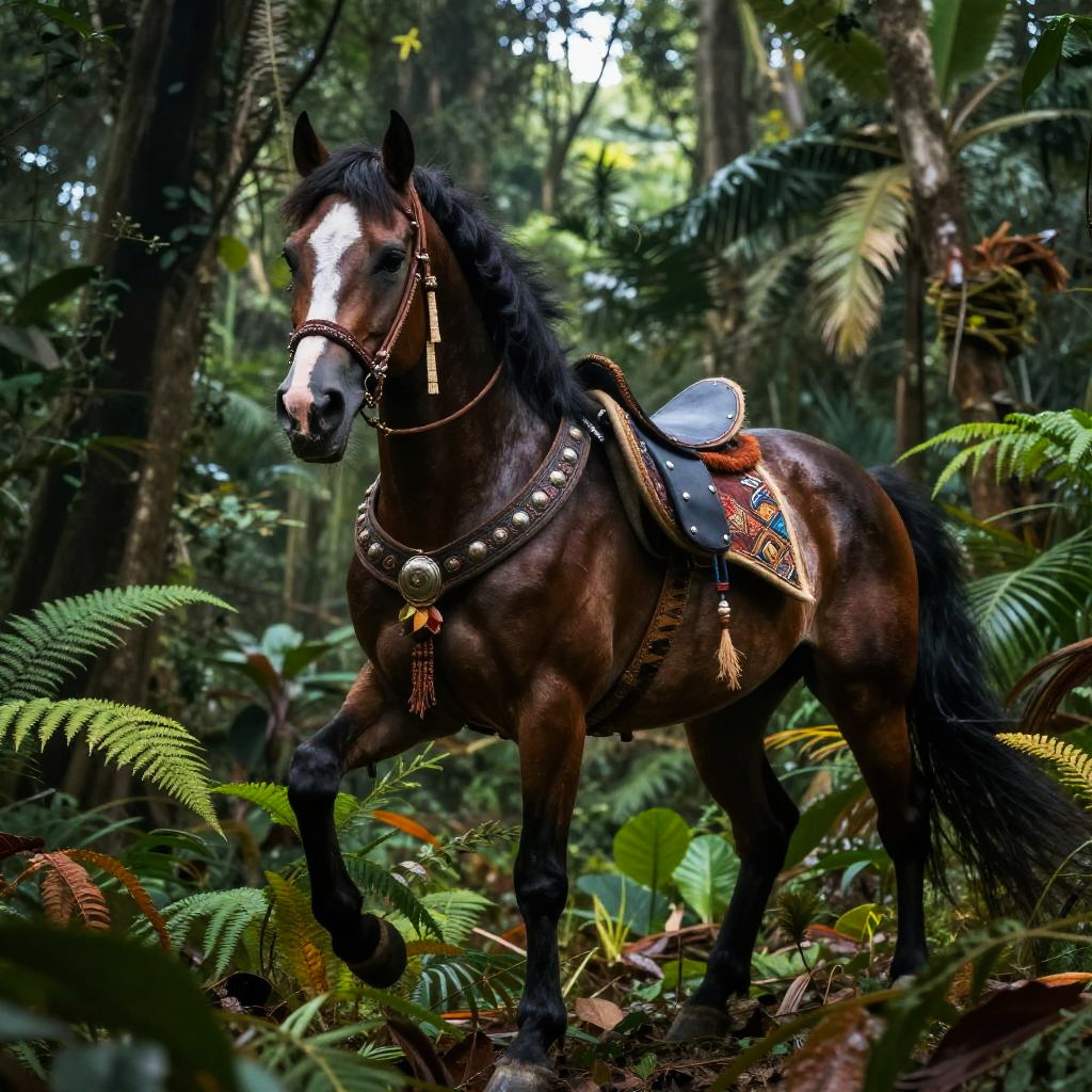 Horse body human head tribal warrior in dense jungle, ornate armor, vibrant foliage, powerful stance, fantasy realism, intense expression