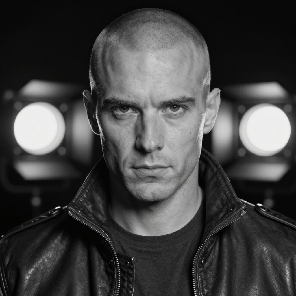 Black and white photograph of a man with a shaved head, intense expression, wearing a dark leather jacket with a high collar. Two bright lights in the background. Man centered, facing camera. Man has fair skin, light eyes.