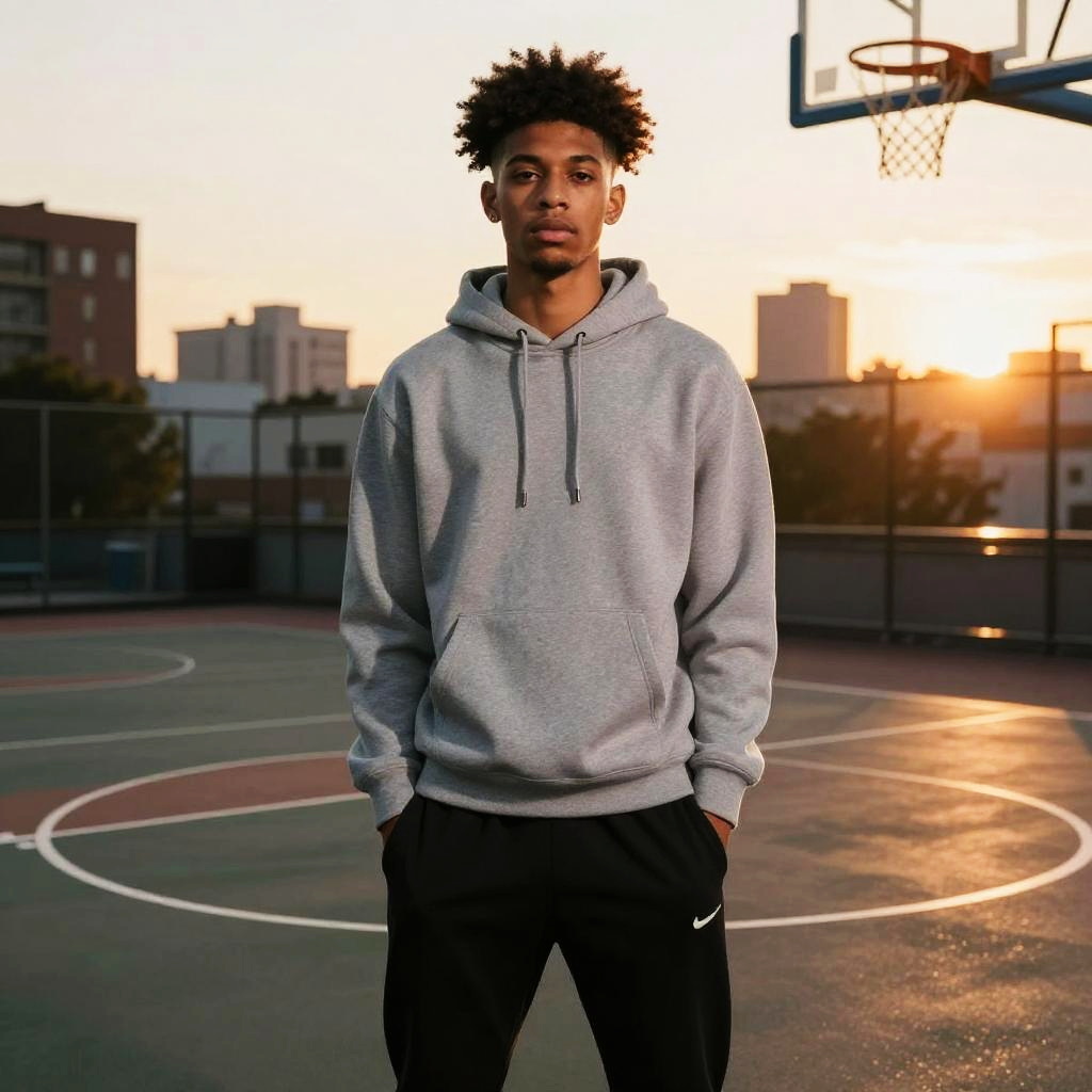 Drop Fade Afro hairstyle on young man, wearing athletic hoodie and joggers, in city basketball court, captured in fashion editorial style with dynamic sunset illumination.
