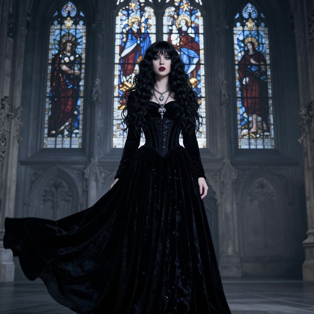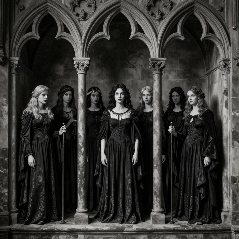 Black and white photograph of six medieval-style female mannequins standing in a gothic archway. Each mannequin has wavy, dark hair, and wears a long, black, intricately patterned gown with a square neckline. They each hold a walking cane. The background features ornate gothic arches and detailed stone columns. The lighting creates high contrast, emphasizing the dark gowns and the stone texture. The mannequins are arranged in two rows, three in the back and three in the front, creating a symmetrical and slightly ominous composition. The overall style evokes a Gothic or Victorian aesthetic.