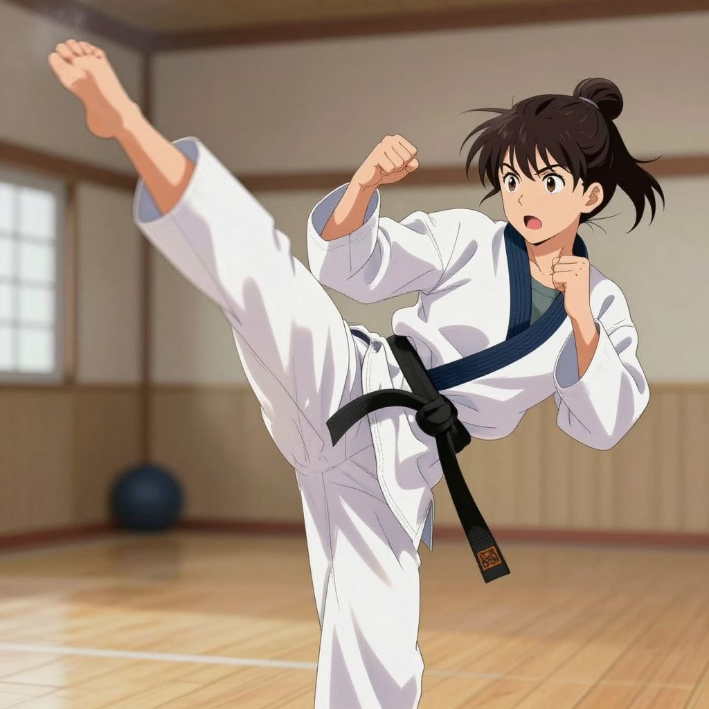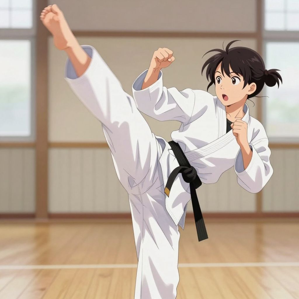 Anime-style drawing of a black-haired girl performing a high karate kick in a dojo, wearing a white gi with a black belt.