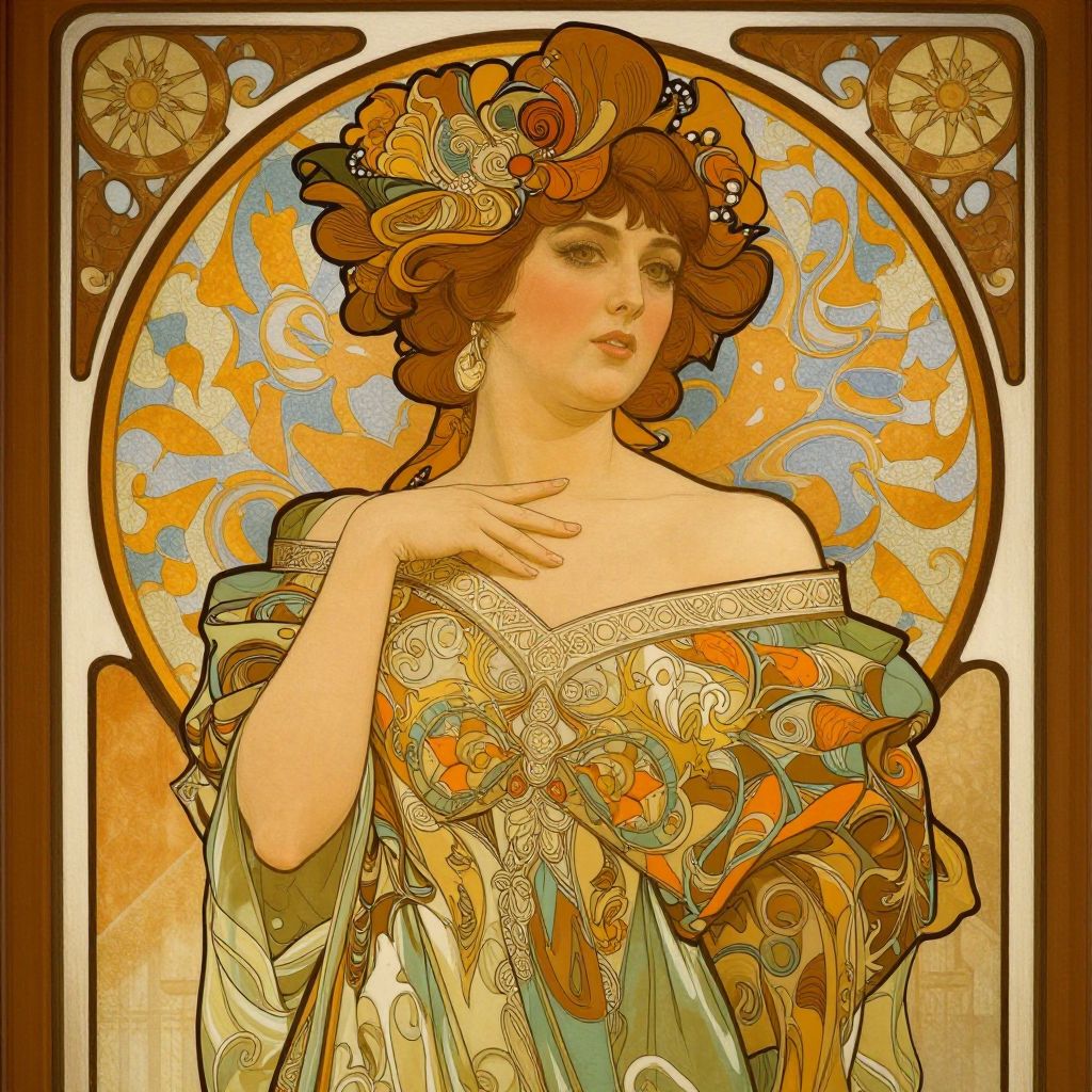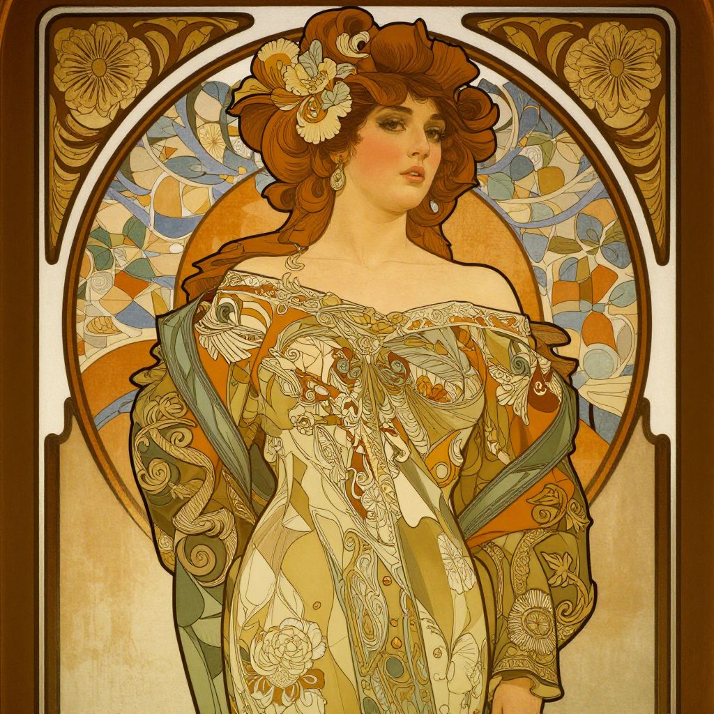 Elegant woman depicted in ornate attire with intricate patterns and vibrant colors, set against a richly decorated frame reminiscent of Alphonse Mucha's art style.