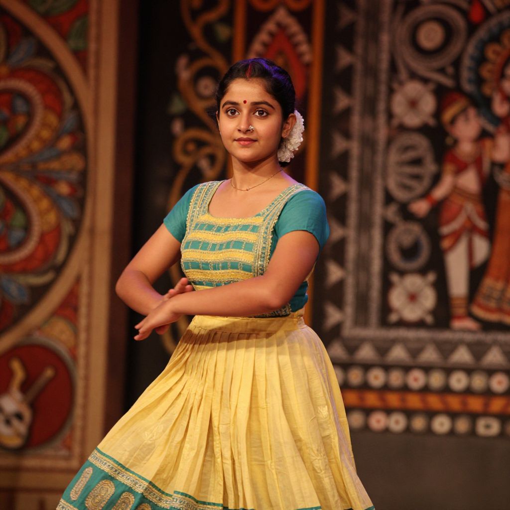 A detailed photo of a young woman with brown eyes, soft features, and a calm expression wearing a cotton Krishna dress as part of a costume performance in a traditional dance theater, with soft stage lighting and decorative Indian motifs in the background, the dress slightly flowing as she moves gracefully on stage.. The woman has big tits and cute face