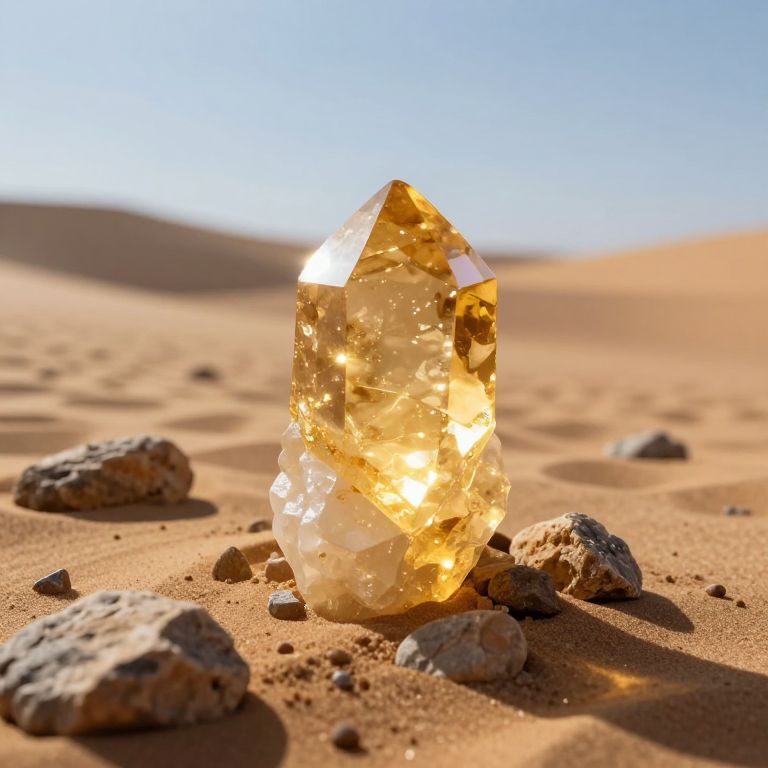 Glowing golden crystal emerges from a sandy dune, surrounded by scattered rocks under a clear sky, embodying the ethereal essence of a philosopher's stone in a desert landscape where whispers transform into luminous gems.