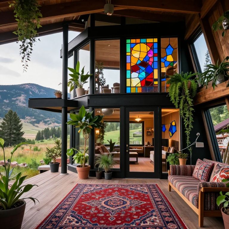 Modern, two-story glass house with vibrant stained glass, wooden beams, potted plants, red patterned rug, and mountain view. Photorealistic