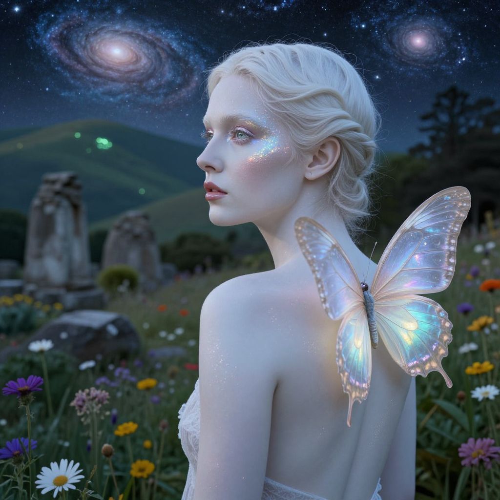 An enigmatic photorealistic portrait of a female subject showcases her captivating ethereal beauty. Her porcelain skin shines with intricate luminous tattoos seamlessly merging into delicate butterfly wings sprouting from her back. As she gazes pensively into the distance, reflections of distant hillsides shimmer in her eyes, swirling galaxies reminiscent of starry night skies. The serene secondary landscape features softly glowing hills where ancient stone ruins harmoniously blend with vibrant wildflowers and lush foliage. This dreamlike fusion evokes an atmosphere of introspection and wonder, capturing the profound connection between human emotions and nature's timeless allure.