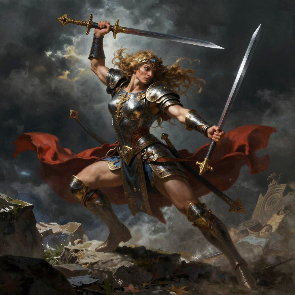 A giant eagle, a woman with golden armor, and a dwarven smith, standing together in a snowy mountain peak, fierce and resolute, styled for D&D, fantasy illustration, highly detailed