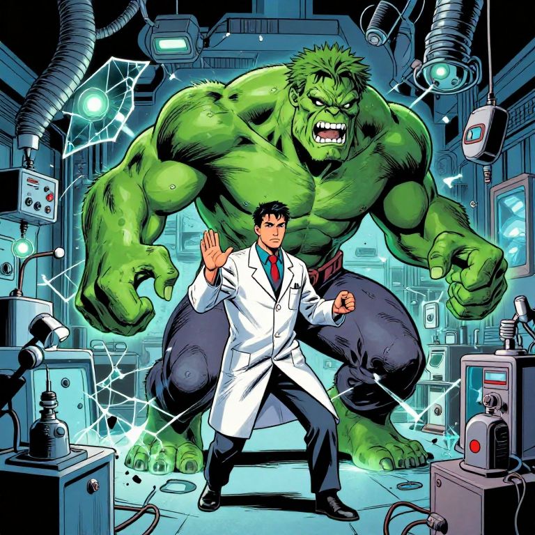 Comic-style illustration: Muscular green Hulk towering behind a white-coated scientist, both posing dramatically in a high-tech laboratory with glowing equipment and cables.