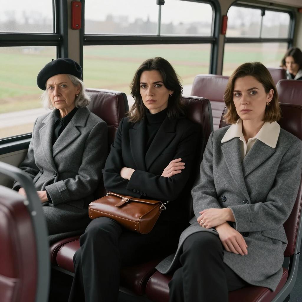Three women sitting in a bus seat. First woman, gray-haired, black beret, gray coat, serious expression, left. Middle woman, dark-haired, black clothing, arms crossed, intense expression, center. Third woman, brown-haired, gray coat with white collar, arms resting on seat, neutral expression, right. Bus windows show green fields outside. Sunlight illuminates the right side. Leather bus seats, red and brown. Middle woman holding brown bag on her lap.