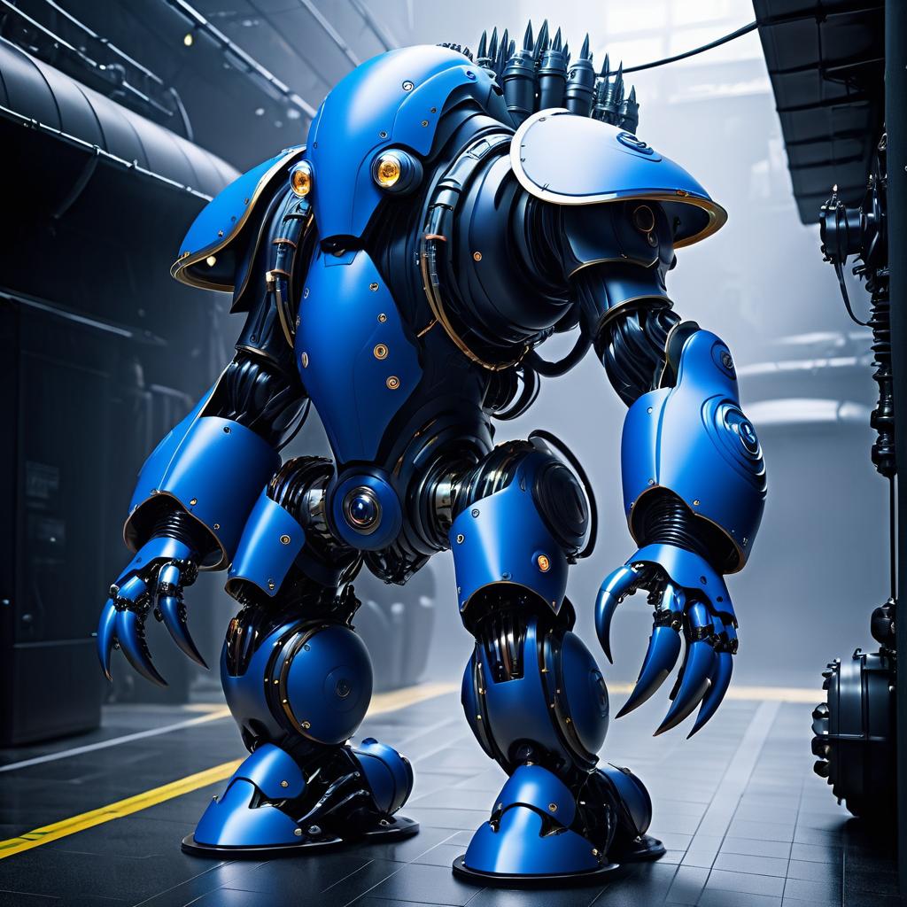 A detailed image of a futuristic robotic figure with a muscular build, featuring sleek silver and black trench coat-style armor. The robot has glowing blue eyes and mechanical tentacle-like attachments extending from its back, set in a high-tech industrial environment.