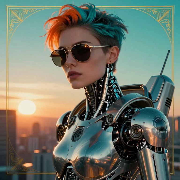 Photorealistic CGI image of a futuristic woman with short, vibrant orange and blue hair, wearing black aviator sunglasses. She has a robotic metallic chest and neck, with visible mechanical joints and wires. Her expression is calm and confident. The background features a blue sky with a sunset, and an ornate circular design in the upper left corner. City buildings are blurred in the distance. The overall style blends sci-fi and cyberpunk elements, with a focus on sleek, metallic textures and bold, colorful details.