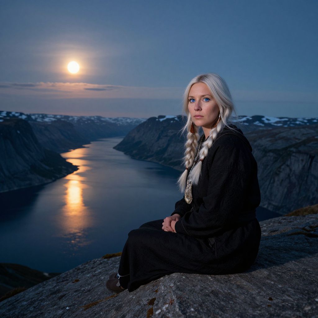 Photograph of a blonde woman with braided hair, wearing a black outfit, sitting on a rocky cliff at dusk, overlooking a moonlit fjord