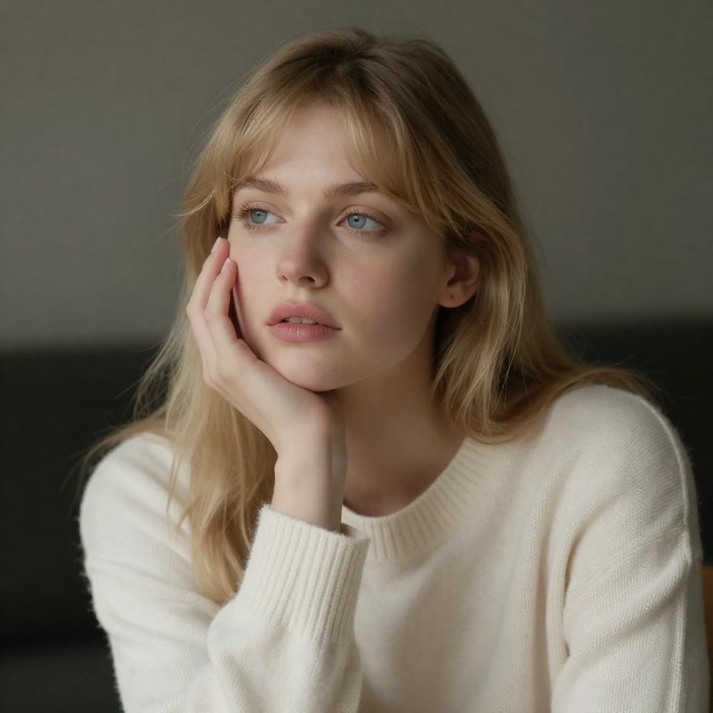 Photograph of a young woman with blonde hair and bangs, wearing a cream-colored knitted sweater. She rests her hand on her cheek, gazing thoughtfully into the distance. Soft light highlights her fair skin and blue eyes, creating a gentle, introspective mood. The background is dark and blurred.