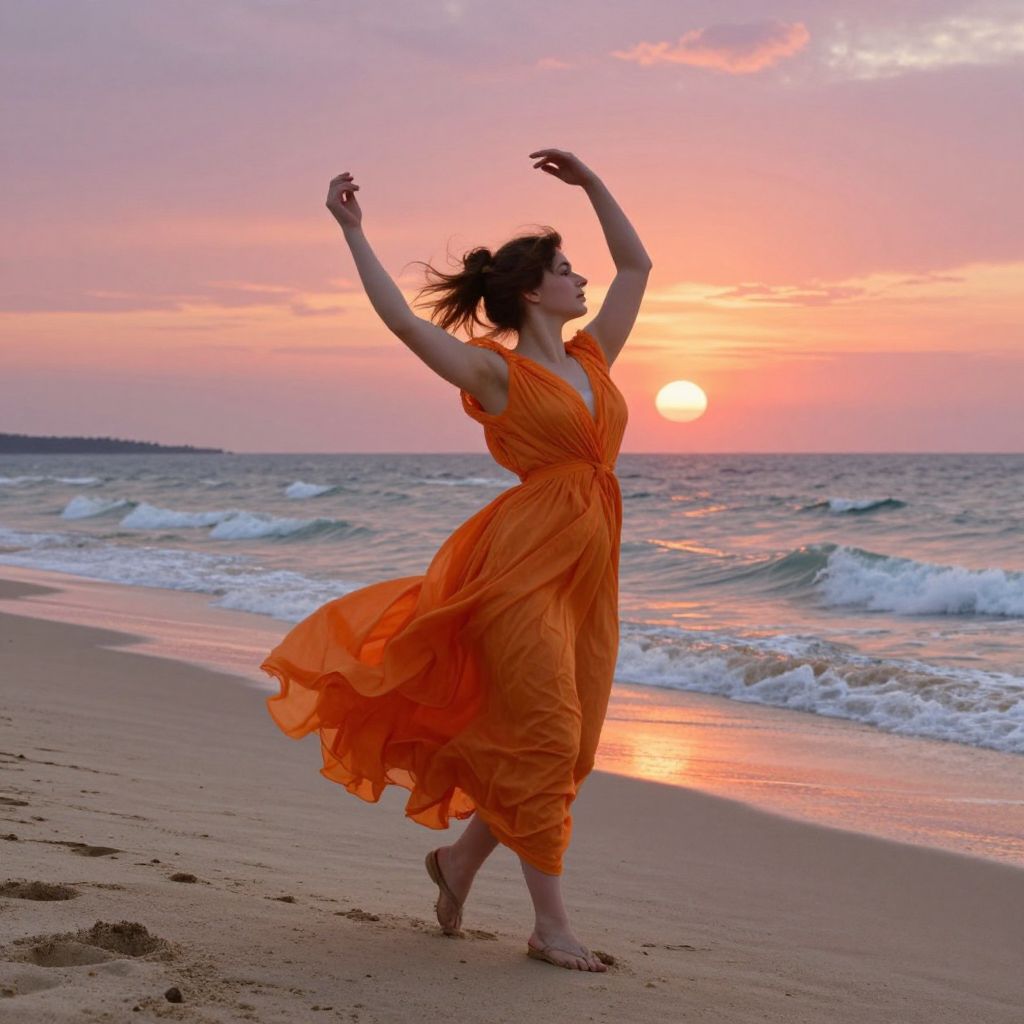 Frederic Leighton's 'Flaming June' (1895) depicts a woman in a flowing orange gown gracefully dancing on a sandy beach, her arms raised as waves gently lap against the shore beneath a vibrant sunset sky.