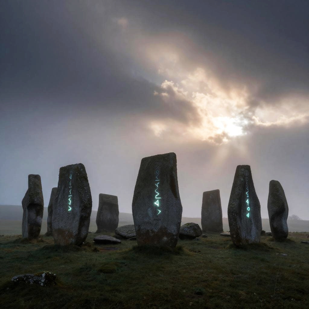 Ronde, an ancient stone circle standing tall on a misty hilltop at dawn, with mystical glowing runes etched on the surfaces, enveloped in ethereal fog and soft light rays breaking through dark clouds, evoking mystery and timelessness.
